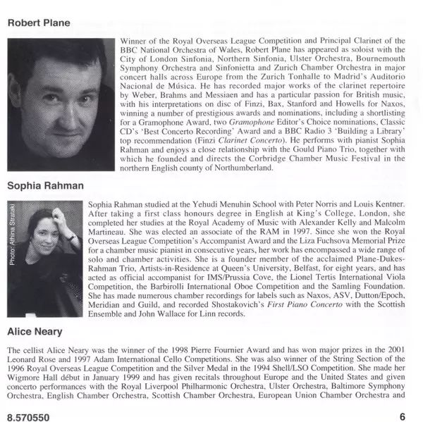 | Artiste | Robert Plane | John Ireland | The Maggini Quartet | Alice Neary | Sophia Rahman | David Pyatt |