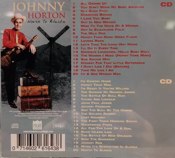 Johnny Horton: North To Alaska La version sur 2CD en Norme édition. Cette édition particulière a été publiée en L'Europe dans la maison d'édition Palais Recordings Le 22 novembre 2022. Album couvre tous les genres Rock, Folk, World, & Country, Country et Rockabilly.