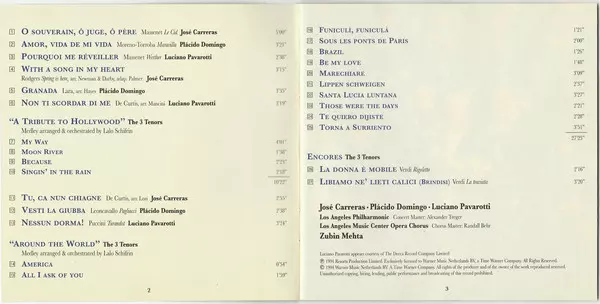 | Artiste | Luciano Pavarotti | Placido Domingo | José Carreras | Zubin Mehta |