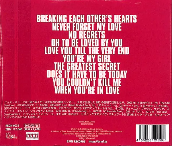Joss Stone: Never Forget My Love La version sur CD en Norme édition. Cette édition particulière a été publiée en Japon dans la maison d'édition BSMF Records Le 1 avril 2022. Album couvre tous les genres Funk / Soul et Gospel.