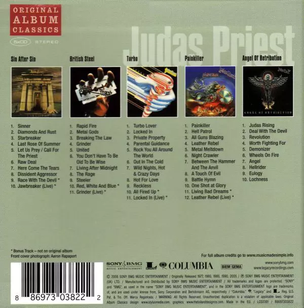 The new "Original Album Classics" series presents the most important artists with their most important original albums. 5 CDs, each in a cardboard sleeve in a slipcase. Uniform look of the series with a large photo of the artist and illustrations of the 5 album covers on the front of the box. Album titles Sin After Sin (1977) British Steel (1980...