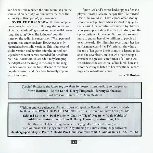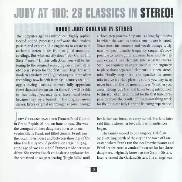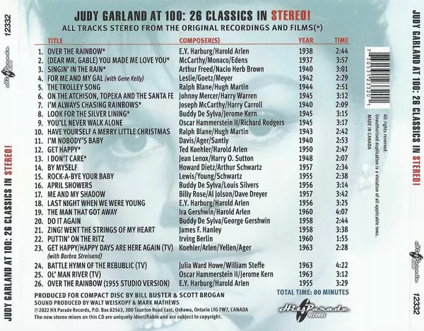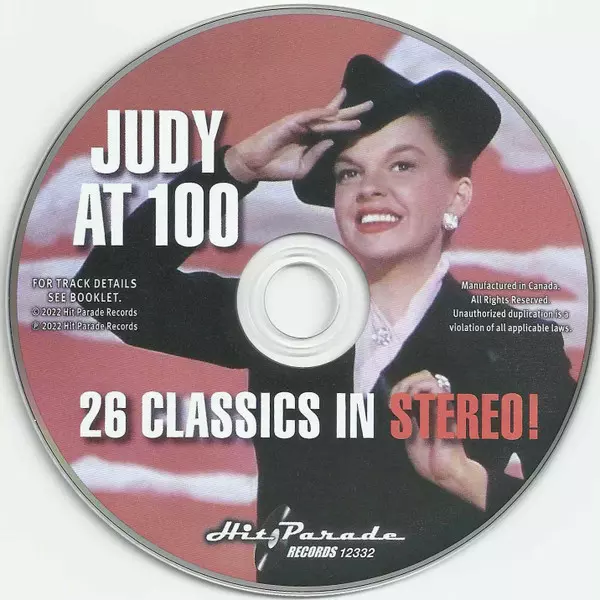 Judy Garland: Judy At 100: 26 Classics In Stereo! La version sur CD en Remasterisé édition. Cette édition particulière a été publiée en Canada dans la maison d'édition Hit Parade Records (4) Le 2 mars 2023. Album couvre tous les genres Pop, Scène et écran et Vocal.