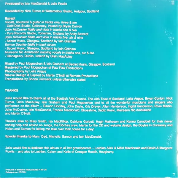 Arranged By Allan Henderson, Iain MacDonald, John Doyle (2), Julie Fowlis | Backing Vocals Muireann Nic Amhlaoibh, Ross Martin | Bouzouki Eamon Doorley | Guitar John Doyle (2) | Harp [Clàrsach], Backing Vocals Ingrid Henderson | Vocals, Backing Vocals, Harmony Vocals, Whistle Julie Fowlis | Whistle Iain MacDonald