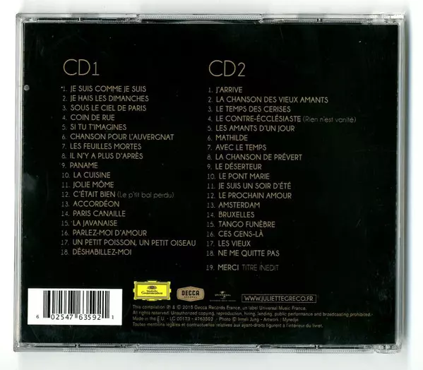 Juliette Gréco: Merci ! ♥ La version sur 2CD en Norme édition. Cette édition particulière a été publiée en France dans la maison d'édition Decca Records France En collaboration avec Deutsche Grammophon Le 12 novembre 2015. Album couvre tous les genres Pop et Chanson.