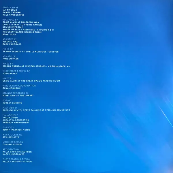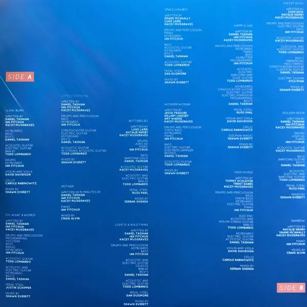 Acoustic Guitar Kacey Musgraves | Backing Vocals, Vibraphone, MIDI Controller [MIDI Strings], Electric Guitar [Stratocaster Guitar], Classical Guitar Daniel Tashian | Classical Guitar, Acoustic Guitar Todd Lombardo | Drums, Percussion, Electric Guitar, Bass Ian Fitchuk | Electric Guitar Kyle Ryan (2) | Mixed By Shawn Everett | Written-By Kacey Musgraves, Luke Dick, Natalie Hemby