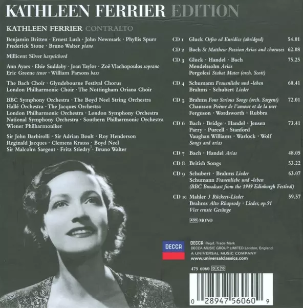 Kathleen Ferrier: Edition La version sur 10CD/Coffret en Remasterisé édition. Cette édition particulière a été publiée en L'Europe dans la maison d'édition Decca Le 26 août 2008. Album couvre tous les genres Musique classique, Opéra et Operetta.