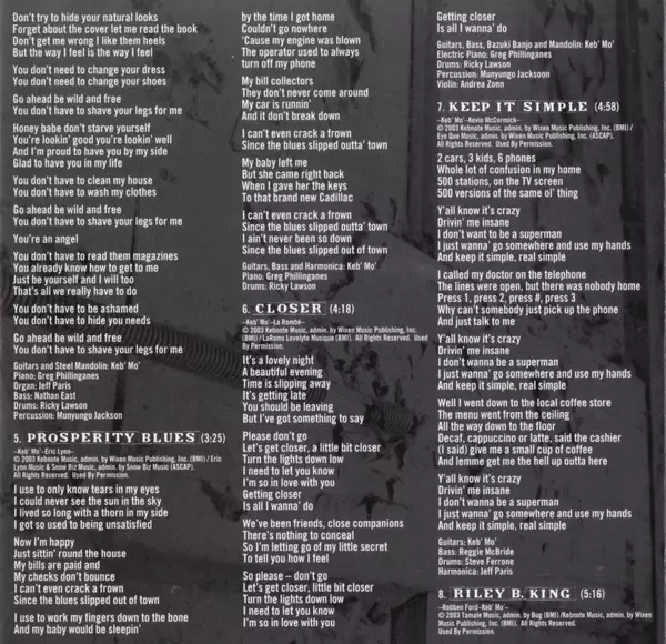 Bass Nathan East | Percussion Munyungo Jackson | Piano Greg Phillinganes | Written-By, Guitar, Vocals, Mandolin [Steel] Keb' Mo' | Written-By, Organ Jeff Paris