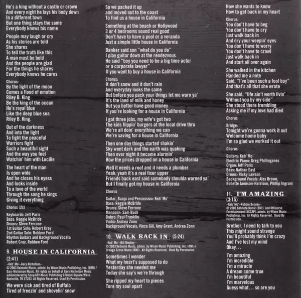 Drums Ricky Lawson | Electric Piano Greg Phillinganes | Percussion Munyungo Jackson | Violin Andrea Zonn | Written-By La Rombé | Written-By, Guitar, Vocals, Bass, Bouzouki [Bazuki], Mandolin Keb' Mo'