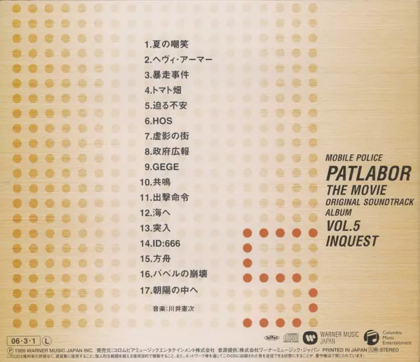 | Titre | Mobile Police Patlabor The Movie Original Soundtrack Album Vol.5 Inquest = 機動警察パトレイバー The Movie オリジナル・サウンドトラック・アルバム Vol.5 Inquest |