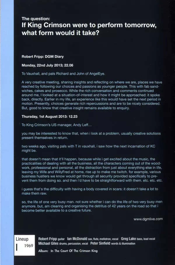 | Bass Tony Levin | Drums Gavin Harrison, Pat Mastelotto, William Rieflin | Guitar Jakko M. Jakszyk, Robert Fripp | Music By King Crimson | Saxophone Mel Collins | |||