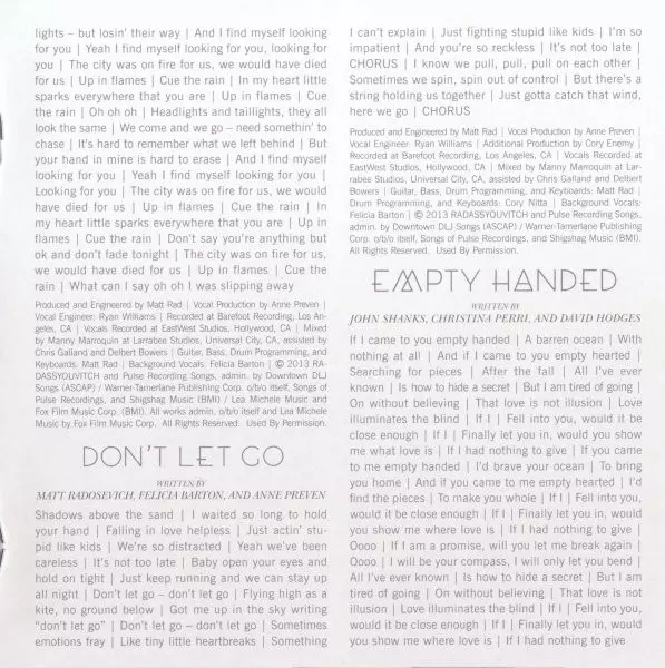 Backing Vocals Felicia Barton | Bass, Drum Programming, Engineer, Guitar, Keyboards, Producer Matt Radosevich | Engineer [Vocals] Ryan Williams | Mixed By Manny Marroquin | Mixed By [Assistant] Chris Galland, Delbert Bowers | Producer [Vocals] Anne Preven | Written-By Anne Preven, Felicia Barton, Lea Michele, Matt Radosevich