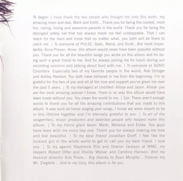 Arranged By [Strings] Oliver Kraus | Backing Vocals Chris Braide, Sia Furler | Engineer [Vocals] Sean Walsh (3) | Keyboards, Piano, Producer, Programmed By, Strings [Fairlight] Chris Braide | Mixed By Tony Maserati | Mixed By [Assistant] Justin Hergett | Producer [Vocals] Anne Preven | Written-By Chris Braide, Lea Michele, Sia Furler