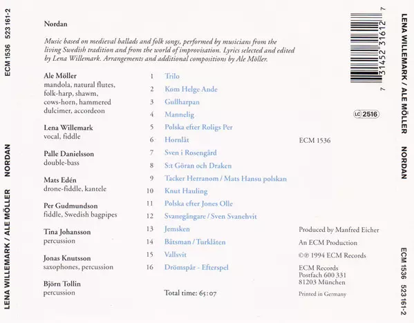 Lena Willemark: Nordan La version sur CD en Norme édition. Cette édition particulière a été publiée en Allemagne dans la maison d'édition ECM Records Le 22 août 2007. Album couvre tous les genres Folk, World, & Country, Jazz, Folk, Contemporary Jazz et Nordic.