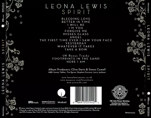 Leona Lewis: Spirit La version sur CD en Norme édition. Cette édition particulière a été publiée en ÉTATS-UNIS dans la maison d'édition J Records En collaboration avec Syco Music et Sony BMG Music Entertainment Le 8 avril 2008. Album couvre tous les genres Funk / Soul et Soul.