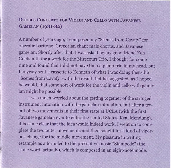 | Double Concerto For Violin And Cello With Javanese Gamelan (1981-82) | 22:52 min | |