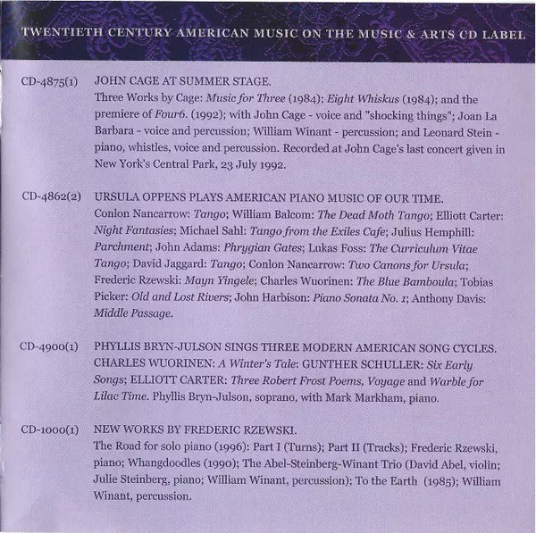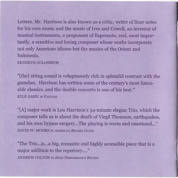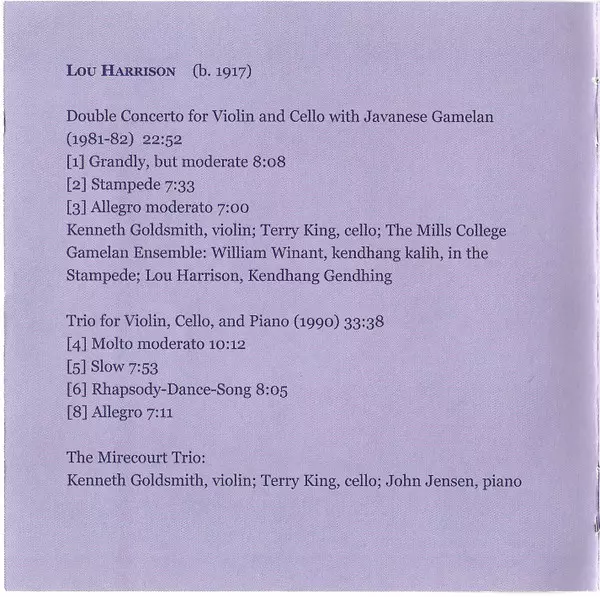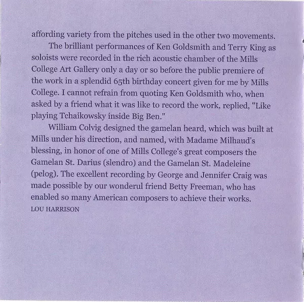 | Cello Terry King (4) | Gamelan The Mills College Gamelan Ensemble | Percussion [Kendhang Kalih] Lou Harrison, William Winant | Violin Kenneth Goldsmith (2) | ||