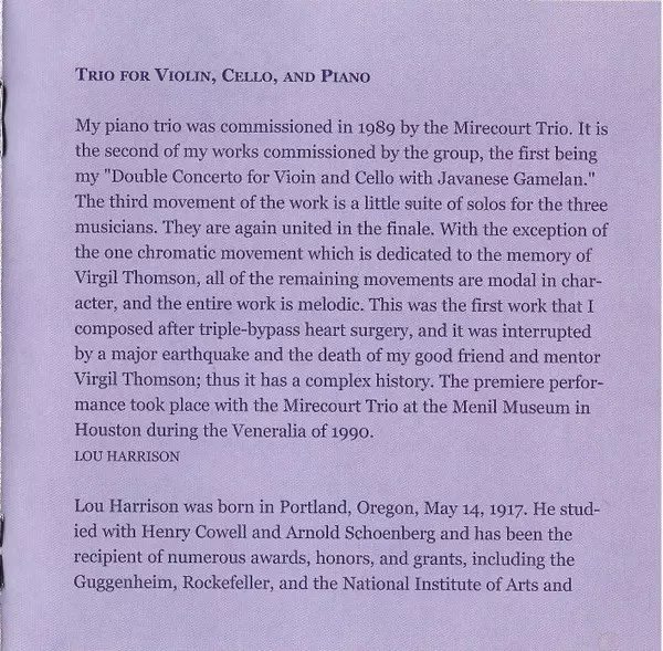 | Artiste | Lou Harrison | The Mirecourt Trio |