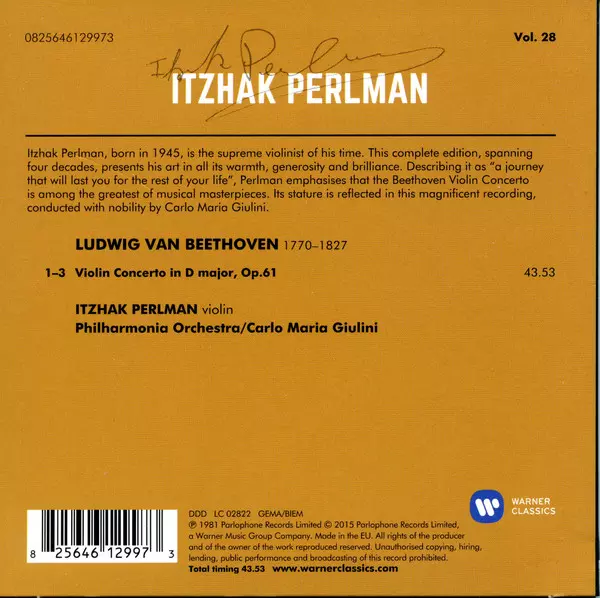 Perlman described Beethoven's violin concerto as "a journey that lasts a lifetime," and emphasized that it is one of the greatest works of music. The significance of this concerto is revealed in this magnificent recording, elegantly conducted by Carlo Maria Giulini.
