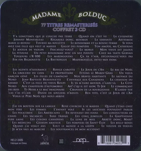 Madame Bolduc: L'anthologie La version sur 3CD/Coffret en Norme édition. Cette édition particulière a été publiée en Canada dans la maison d'édition Disques Helena Le 6 novembre 2007. Album couvre tous les genres Pop, Folk, World, & Country, Folk et Chanson.