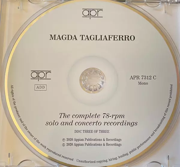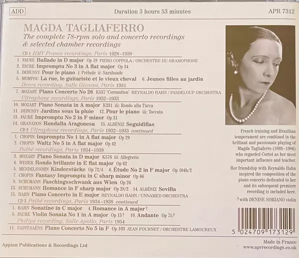 Magda Tagliaferro: The Complete 78-rpm Solo And Concerto Recordings La version sur 3CD/Coffret en Remasterisé édition. Cette édition particulière a été publiée en Dans le monde entier dans la maison d'édition APR Le 4 septembre 2020. Album couvre tous les genres Musique classique, Modernism, Romance et Impressionistic.