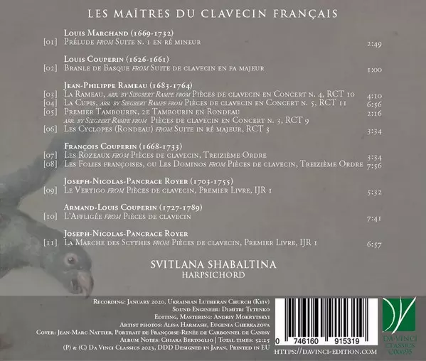 | Artiste | Jean-Philippe Rameau | François Couperin | Louis Couperin | Joseph Nicolas Pancrace Royer | Armand-Louis Couperin | Louis Marchand | Svitlana Shabaltina |