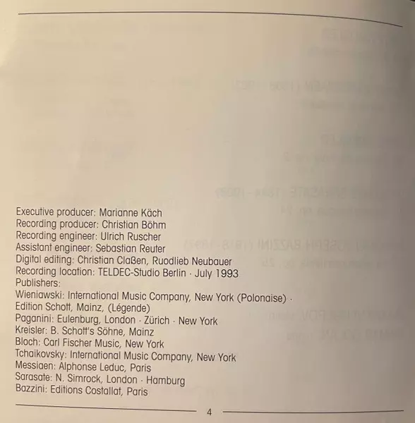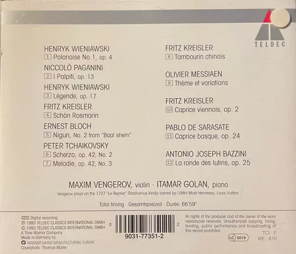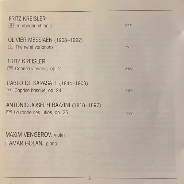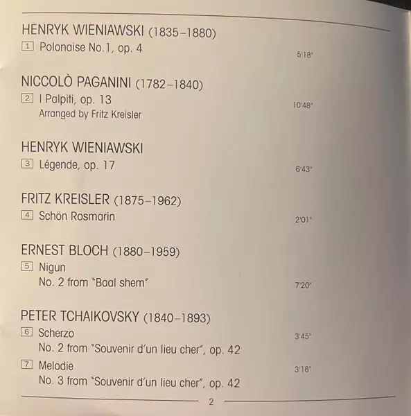 | Artiste | Pyotr Ilyich Tchaikovsky | Niccolò Paganini | Olivier Messiaen | Pablo De Sarasate | Henryk Wieniawski | Fritz Kreisler | Ernest Bloch | Maxim Vengerov | Antonio Bazzini |