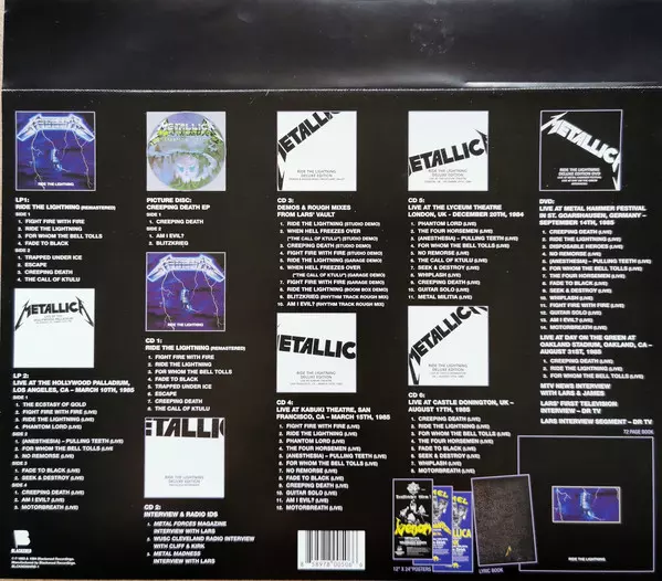 Metallica: Ride The Lightning DLX | LTD | NUM | PIC La version sur Le vinyle 4LP/6CD/DVD/Coffret en deluxe Limité Numéroté individuellement Remasterisé Picture Disc édition. Cette édition particulière a été publiée en ÉTATS-UNIS dans la maison d'édition Blackened Recordings Le 2 juin 2016.