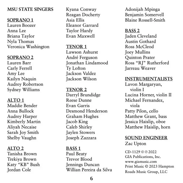 | Artiste | Michael John Trotta | Mississippi State University State Singers | Gary Packwood | Roza Tulyaganova | Jeanette Fontaine | Christy Lee |