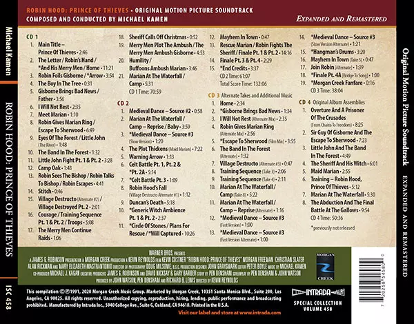 Michael Kamen: Robin Hood: Prince of Thieves (Original Motion Picture Soundtrack) La version sur 4CD en Remasterisé édition. Cette édition particulière a été publiée en ÉTATS-UNIS dans la maison d'édition Intrada Le 9 octobre 2020. Album couvre tous les genres Soundtrack, Film Score et Cinematic Classical. Expanded Edition 4CD.