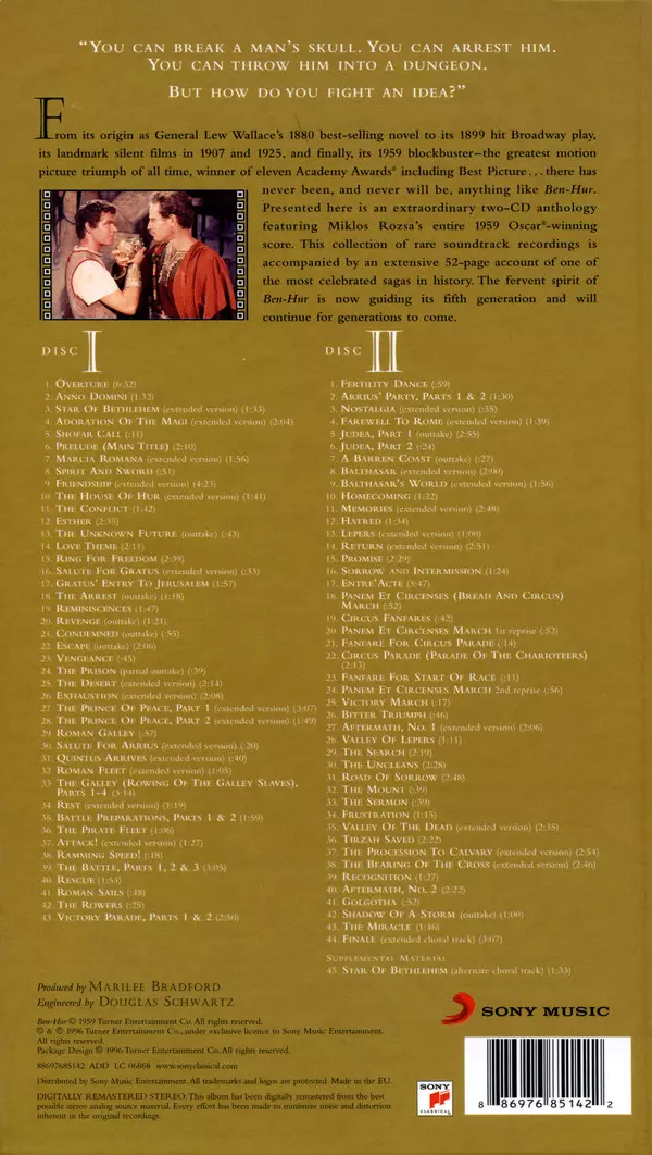 Miklós Rózsa: Ben-Hur A Tale Of The Christ La version sur 2CD en Norme édition. Cette édition particulière a été publiée en ROYAUME-UNI dans la maison d'édition Sony Music En collaboration avec Sony Classical Le 23 octobre 2015. Album couvre tous les genres Musique classique, Scène et écran, Score et Soundtrack.