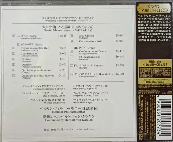 | Artiste | Wolfgang Amadeus Mozart | Herbert von Karajan | Berliner Philharmoniker | Wiener Singverein | Peter Schreier | Barbara Hendricks | Benjamin Luxon | Janet Perry |
