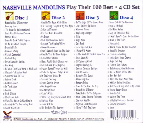 The Nashville Mandolins: Play Their 100 Best La version sur 4CD en Norme édition. Cette édition particulière a été publiée en ÉTATS-UNIS dans la maison d'édition Gusto Records (2) Le 15 février 2013. Album couvre tous les genres Folk, World, & Country, Country et Bluegrass.