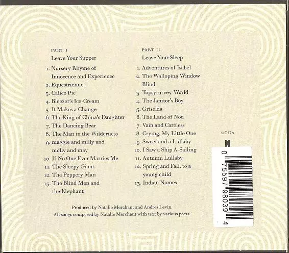 Natalie Merchant: Leave Your Sleep La version sur 2CD en Norme édition. Cette édition particulière a été publiée en Europe et États-Unis dans la maison d'édition Nonesuch Le 16 avril 2010. Album couvre tous les genres Folk, World, & Country, Folk, Bluegrass, Musique celtique et Romani.