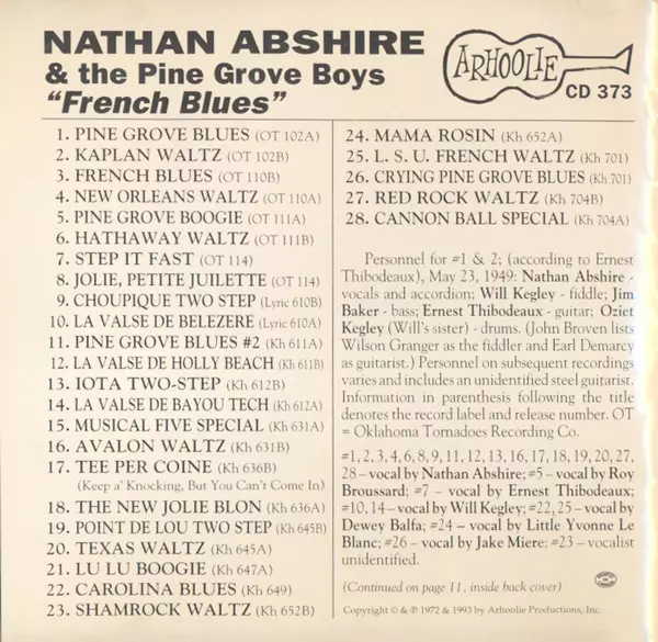 | Bass Jim Baker (15) | Drums Sadie Kegley | Fiddle [According To Ernest Thibodeaux] Will Kegley | Fiddle [According To John Broven] Wilson Granger | Guitar [According To Ernest Thibodeaux] Ernest Thibodeaux | Guitar [According To John Broven] Earl Demary | Vocals, Accordion Nathan Abshire | |||