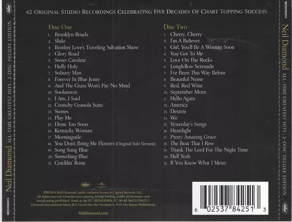 "All-Time Greatest Hits" is the most comprehensive collection of hits by Neil Diamond, who was inducted into the Rock and Roll Hall of Fame. Neil Diamond's "All-Time Greatest Hits" 2LP includes original studio recordings of classic songs like "Sweet Caroline", "Holly Holy", "I Am...I Said" and chart-topping hits like "Cracklin' Rosie", "Song Sun...
