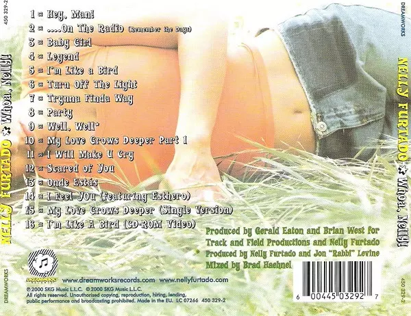 "Whoa, Nelly!" is the debut studio album by Canadian singer-songwriter Nelly Furtado, released on October 24, 2000. The album represents a fusion of genres, including pop, folk, hip-hop, and R&B, showcasing Furtado's eclectic musical style and lyrical introspection. Among its tracks are the hit single "I'm Like A Bird," which became a radio favorite and won her a Grammy Award for Best Female Pop Vocal Performance. Other notable songs include the energetic "Turn Off the Light," the introspective "Shit On The Radio (Remember the Days)," and the vibrant "Hey, Man!" The album also features tracks such as "Baby Girl," "I Feel You," "Party," "Well, Well," "Legend," "Trynna Finda Way," "My Love Grows Deeper Part 1," "I Will Make U Cry," "Scared Of You," and the Portuguese-language song "Onde Estas." With its diverse sound and youthful spirit, "Whoa, Nelly!" helped establish Furtado as a unique voice in the early 2000s music scene.