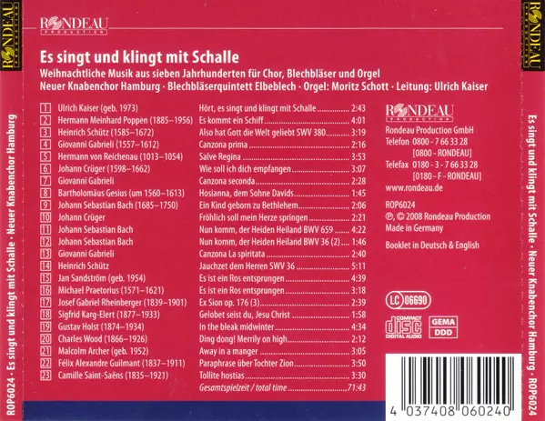 Neuer Knabenchor Hamburg: Es Singt Und Klingt Mit Schalle La version sur CD en Norme édition. Cette édition particulière a été publiée dans la maison d'édition Rondeau Production Le 12 septembre 2011. Album couvre tous les genres Musique classique, Musique baroque, Modernism, Romance et Medieval.