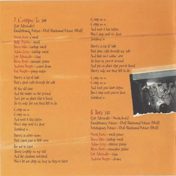 Acoustic Guitar Jesse Harris, Kevin Breit | Bass Lee Alexander | Groovebox [Box] Andrew Borger | Organ [Pump Organ] Rob Burger | Vocals, Piano Norah Jones | Written-By Lee Alexander, Richard Julian