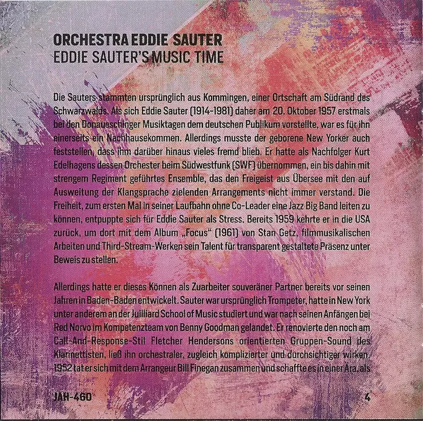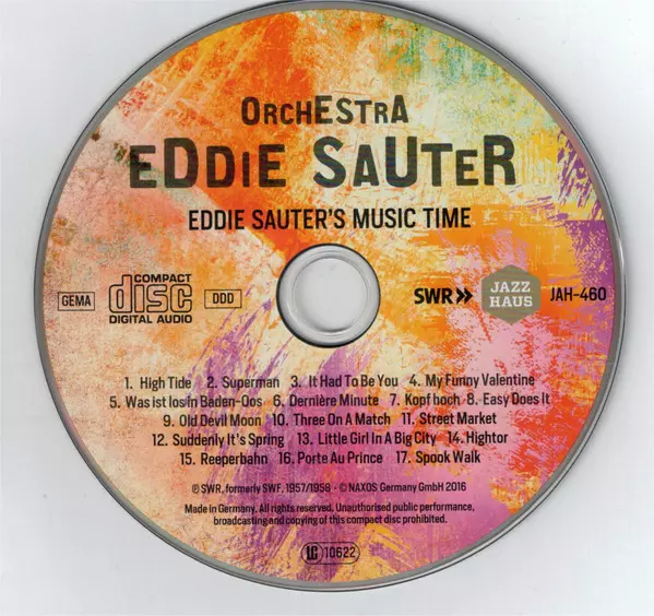 Orchester Eddie Sauter: Eddie Sauter's Music Time La version sur CD en Remasterisé édition. Cette édition particulière a été publiée en Allemagne dans la maison d'édition Jazzhaus Le 29 juillet 2016. Album couvre tous les genres Jazz, CoolJazz et Big Band.