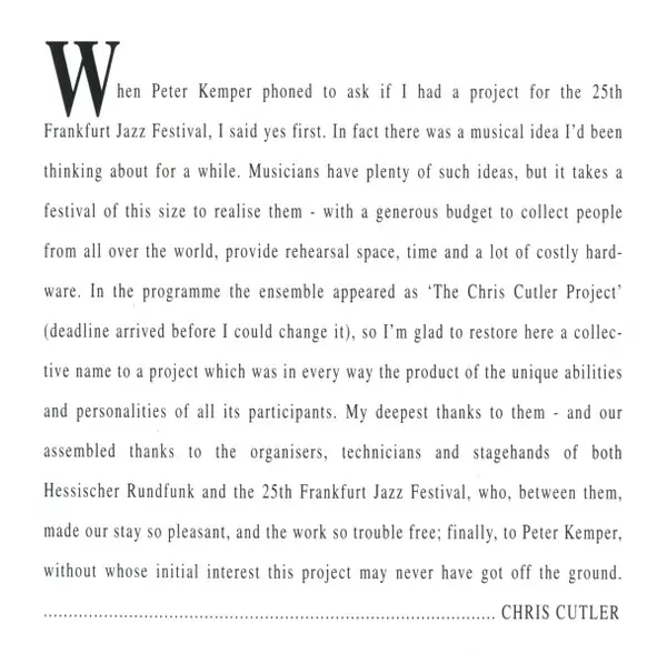 | Artiste | Chris Cutler | Lutz Glandien | Otomo Yoshihide | Zygmunt Krauze | p53 | Marie Goyette |