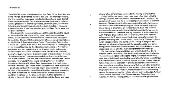 | Artiste | Paul Bley | Evan Parker | Barre Phillips |