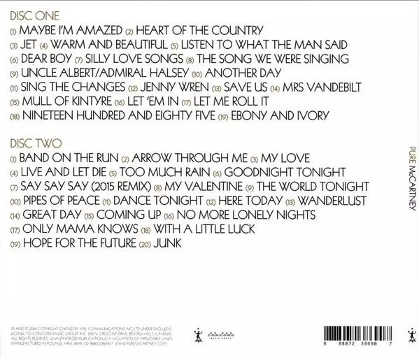 Paul McCartney: Pure McCartney La version sur 2CD en Norme édition. Cette édition particulière a été publiée en L'Europe dans la maison d'édition MPL (2) En collaboration avec Concord Music Group Le 6 décembre 2019.