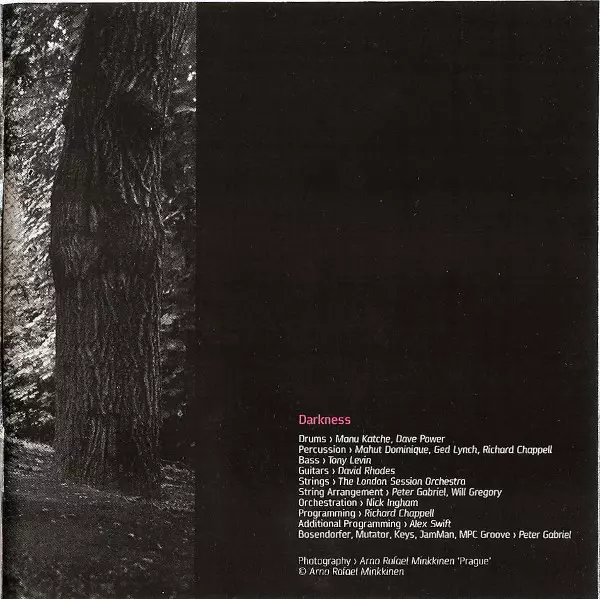 Bass Tony Levin | Double Bass Danny Thompson | Drum Programming [Supercollider] Chris Hughes | Drums Dominic Greensmith, Steve Gadd | Guitar [Guitars] David Rhodes | Percussion Ged Lynch | Piano [Middle Section Backwards Piano] Mitchell Froom | Piano, Sampler [Sample Keys], Harmonium, Tom Tom [Tom Toms], Crotales, Sampler [JamMan], Bass [Arpeggiated Bass], Guitar [Telecaster], Sampler [MPC Groove] Peter Gabriel | Programmed By [Programming] Richard Chappell | Recorder [Recorders] Richard Evans (3) | Tabla [Tablas] Hossam Ramzy