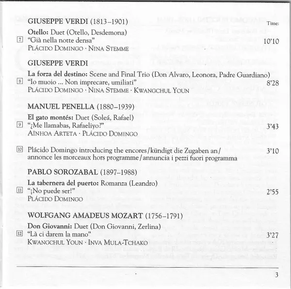 | 10 | Placido Domingo: Plácido Domingo Introducing The Encores = Kündigt Die Zugaben An = Annonce Les Morceaux Hors Programme = Aunnuncia I Pezzi Fuori | 3:10 min | |