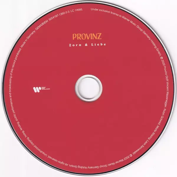 Provinz: Zorn & Liebe La version sur CD en Norme édition. Cette édition particulière a été publiée en Allemagne, Autriche et Suisse dans la maison d'édition Warner Music Central Europe Le 16 septembre 2022. Album couvre tous les genres Pop et Indie-Pop.