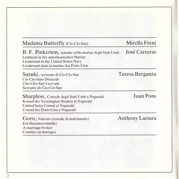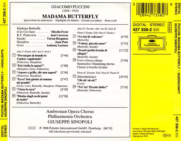 | Artiste | José Carreras | Philharmonia Orchestra | Giacomo Puccini | Mirella Freni | Giuseppe Sinopoli | Teresa Berganza | The Ambrosian Opera Chorus | Juan Pons |