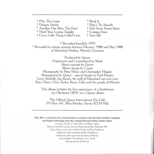 For The Game, Queen collaborated with Reinhold Mack for the first time. In his Musicland Studios in Munich, the music producer rediscovered the band's sound. Here, Queen sound more polished than before and deliver an unadulterated pop album. Mack, who also worked as a sound engineer for the Electric Light Orchestra, introduced Mercury and his co...