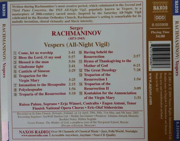| Artiste | Sergei Vasilyevich Rachmaninoff | Suomen Kansallisoopperan Kuoro | Raissa Palmu | Erja Wimeri | Eugen Antoni | Eric-Olof Söderström |