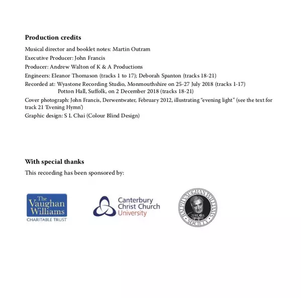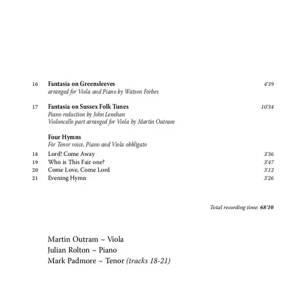 | Artiste | Ralph Vaughan Williams | Mark Padmore | Martin Outram | Julian Rolton |