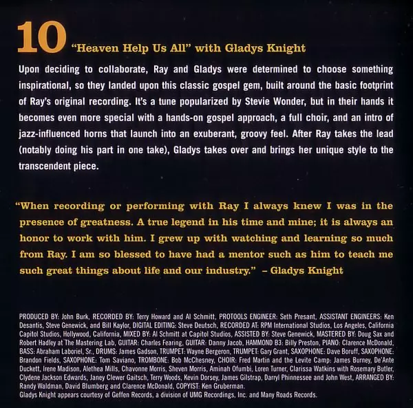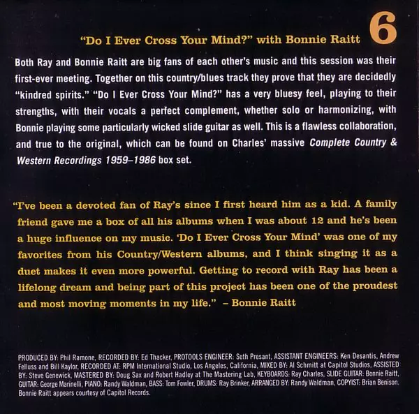 | Bass Tom Fowler | Drums Ray Brinker | Electric Organ [Hammond B3] Billy Preston | Guitar Irvin Kramer | Keyboards Ray Charles | Vocals [Duet], Piano Norah Jones | |||